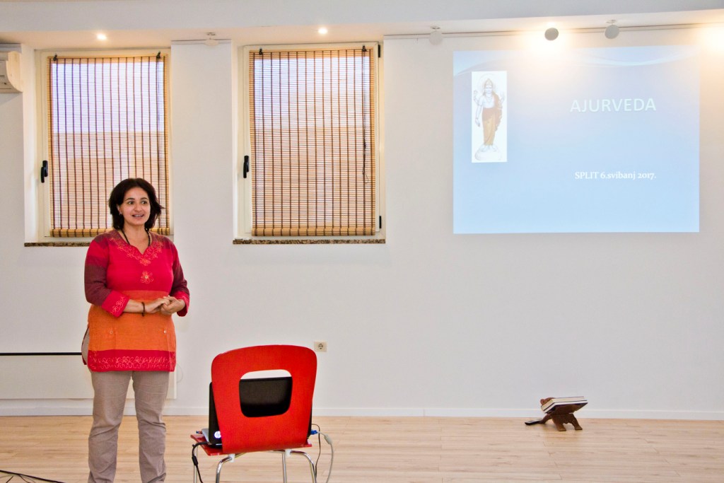 Istog dana predvečer Ivona je održala predavanje na temu “Primjena Ajurvede u modernom vremenu”. Upoznala nas je sa osnovnim konceptima ajurvede i objasnila kako živjeti u skladu sa izmjenama godišnjih doba, jer je to vrijeme kada je naš organizam posebno podložan različitim poremećajima. Objasnila je i što je ama, odnosno neprobavljeni toksini u tijelu te način na koji se mogu prepoznati simptomi nagomilane ame i slabe probavne vatre, kao i njihovog rješavanja – detoksifikacije organizma i naravno, vježbanje joge.