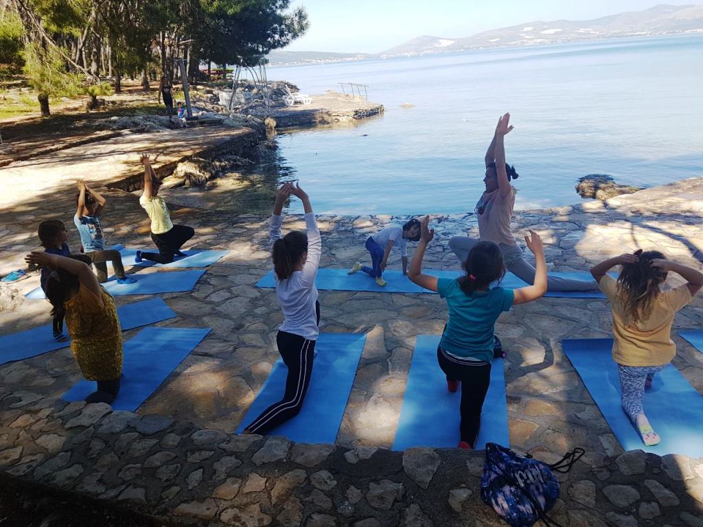 Okupili su se na ulazu Spinutska vrata odakle je velika skupina djece polaznika, roditelja, braće i sestara, čak i baka te psića krenuli u šetnju prema Benama. Tamo su na platou tik uz more, u debeloj hladovini imali svoj završni sat joge. Pri tome su djeca imala priliku predstaviti svoju najdražu asanu i izvesti je samostalno. Nakon vježbanja je dobro došlo osvježenje uz zdrave grickalice i voćne sokove. Vrijeme nakon programa su djeca provela družeći se i igrajući, a dio malih vježbača je izradio i poklončiće za sve sudionike izleta tj. mirisne bonbončiće sa lavandom. Na kraju izleta usljedilo je iznenađenje, a to je bio vlakić koji je preveo veselu družinu do mjesta polaska. Jedni drugima zaželjeli su sretne ljetne praznike uz puno kupanja i odmaranja. Instruktorica im je najavila pohvalnice za veliki trud i vježbanje joge koje će im stići poštom.