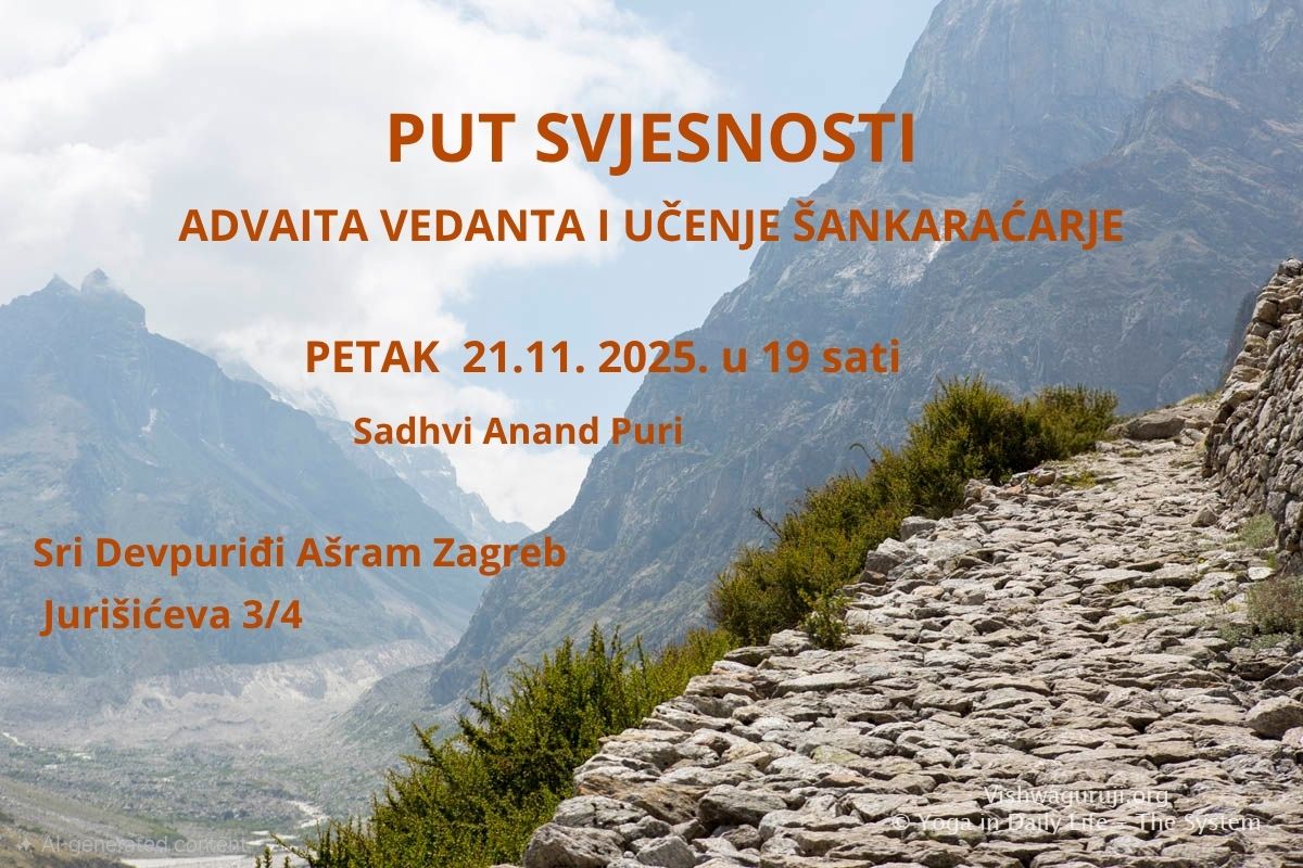 21. studeni 2025. - U petak navečer održano je još jedno predavanje i meditacija, ovoga puta na temu svjesnosti s uvodom o Advaita Vedanti i Sri Adi Šankaraćariji. Kao što nas uči joga, ništa bez prakse, nakon predavanja je bila i meditacija. Predavanje i meditaciju je vodila Swami Anandi.